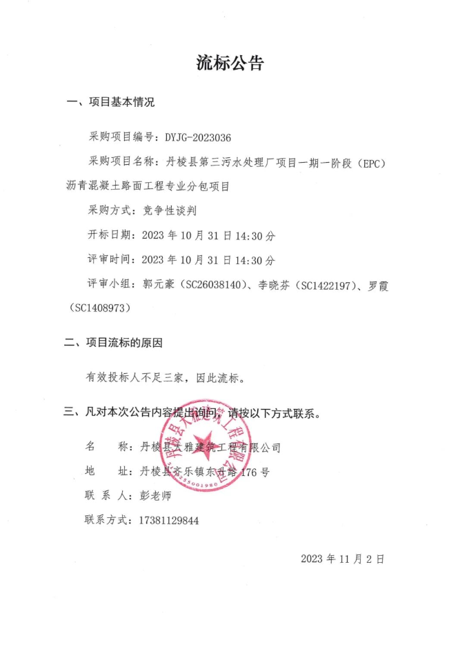 丹棱縣第三污水處理廠項目一期一階段(EPC)瀝青混凝土路面工程專業分包項目流標公告
