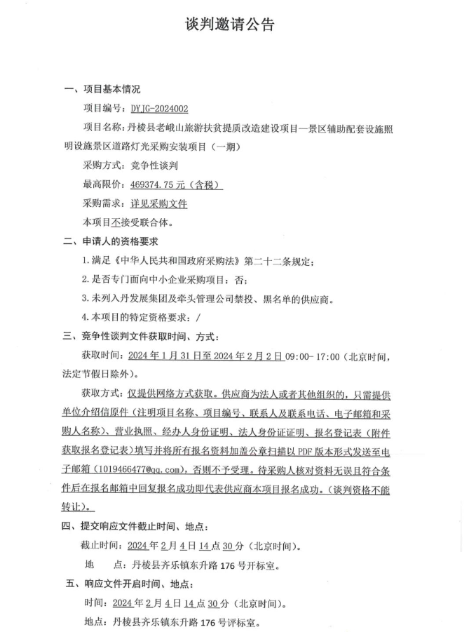 丹棱縣老峨山旅游扶貧提質改造建設項目——景區輔助配套設施照明設施景區道路燈光采購安裝項目(一期)談判邀請公告