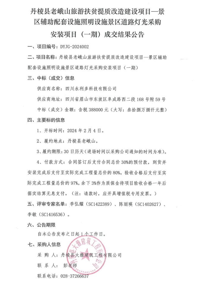 丹棱縣老峨山旅游扶貧提質改造建設項目—景區輔助配套設施照明設施景區道路燈光采購安裝項目(一期)成交結果公告