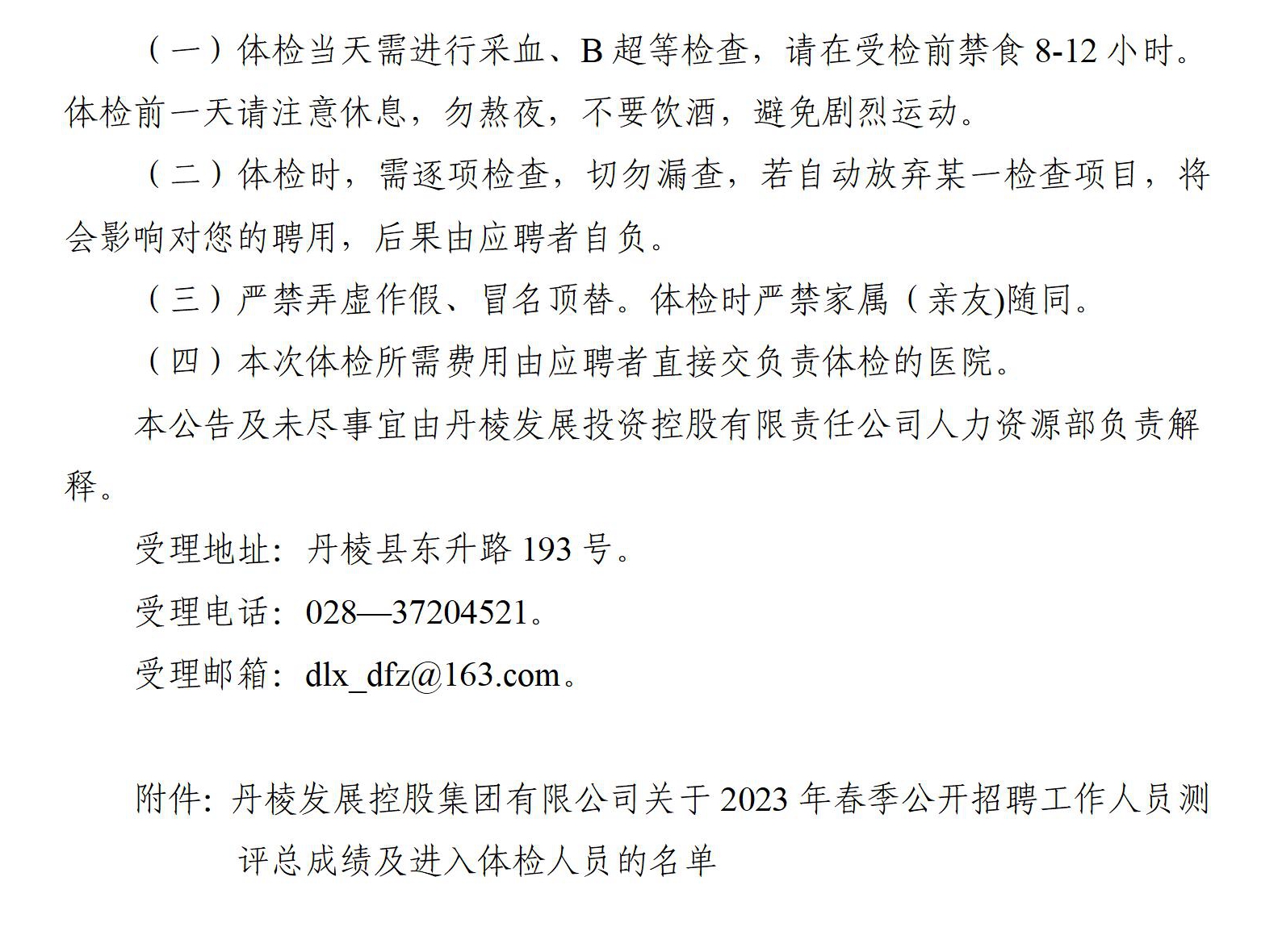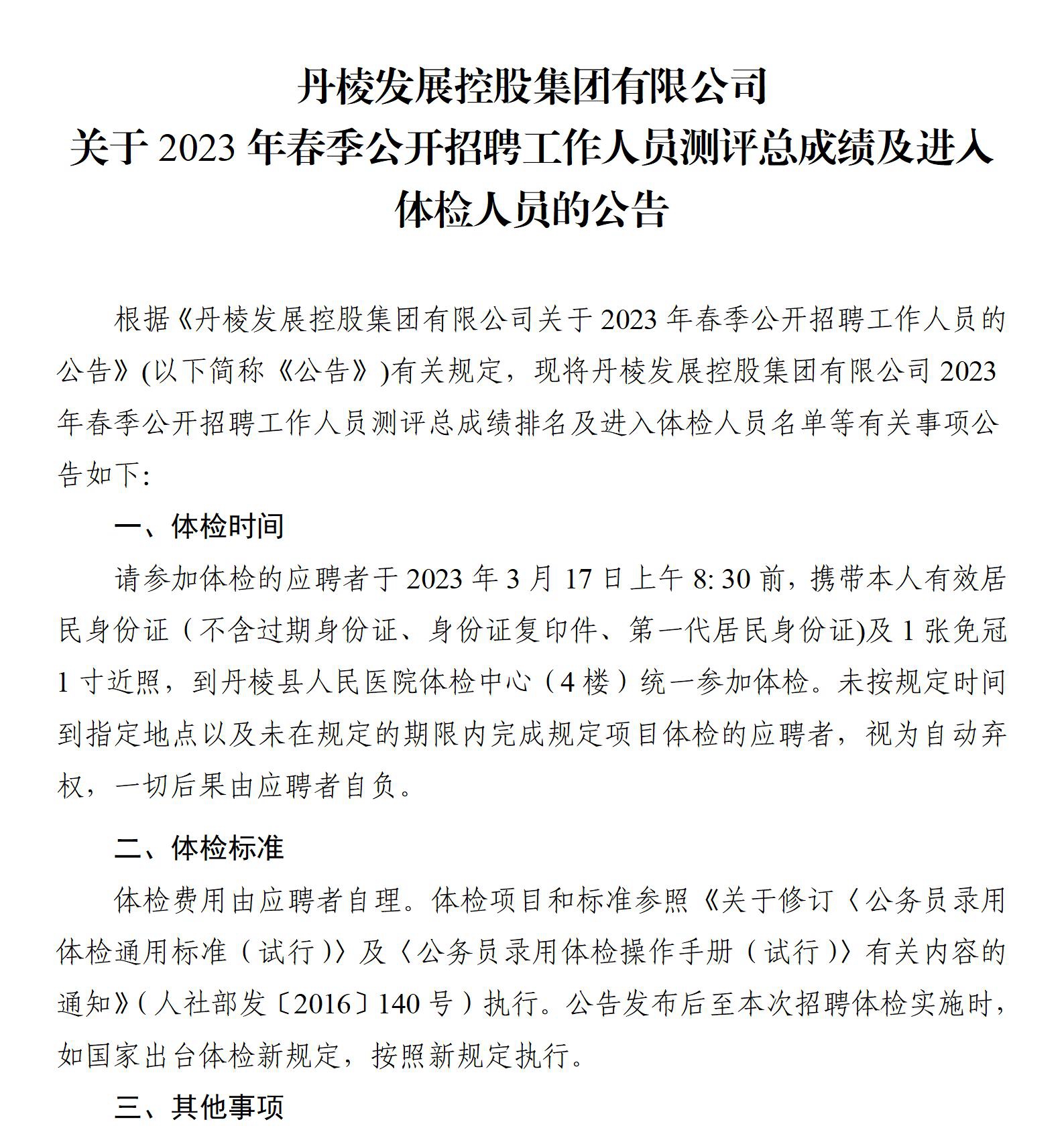 丹棱發展控股集團有限公司關于2023年春季公開招聘工作人員測評總成績及進入體檢人員的公告