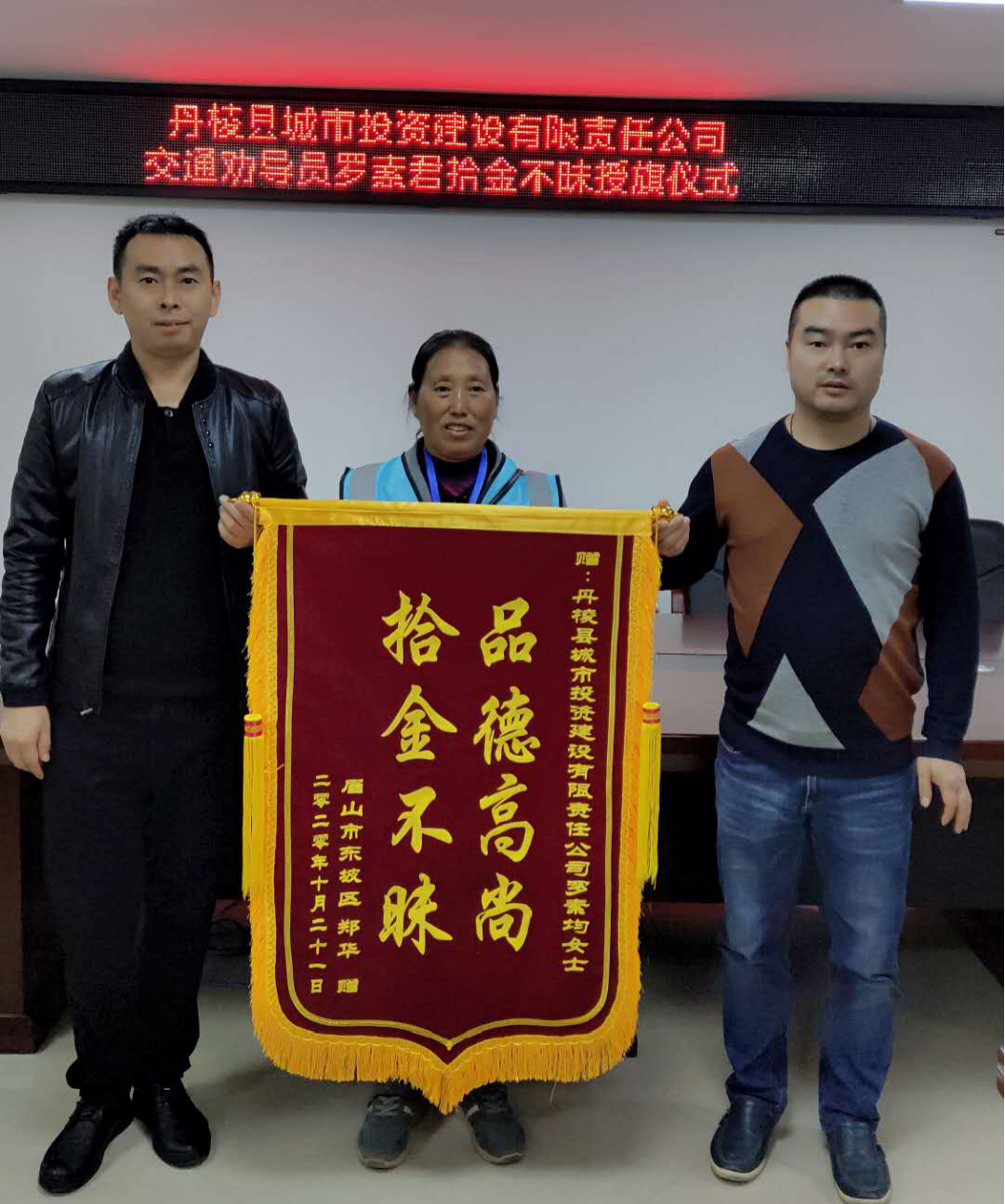 10月20日傍晚,丹棱縣城市投資建設有限責任公司交通勸導員羅素君在南岸A區路邊停車位值守時,撿拾到一個錢包,內有約1000元現金、身份證、銀行卡、發票資料、保險柜鑰匙、汽車鑰匙等重要物品。羅素君立即把此事上報公司并通過失主發票上的電話號碼聯系失主親手交還。