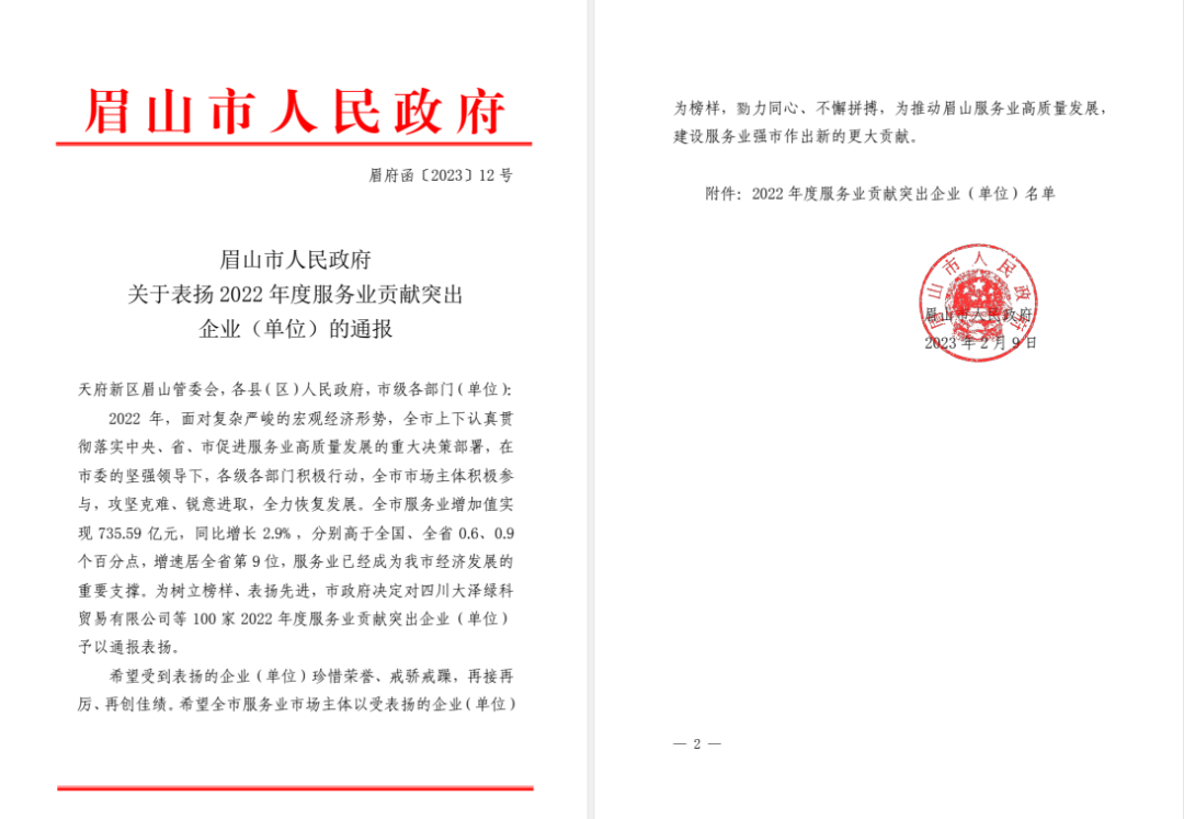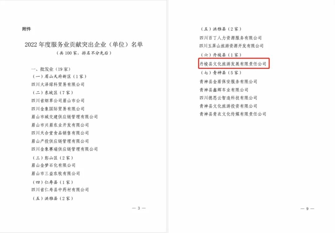 點贊!丹棱縣文化旅游發展有限責任公司榮獲眉山市2022年度服務業貢獻突出企業榮譽稱號